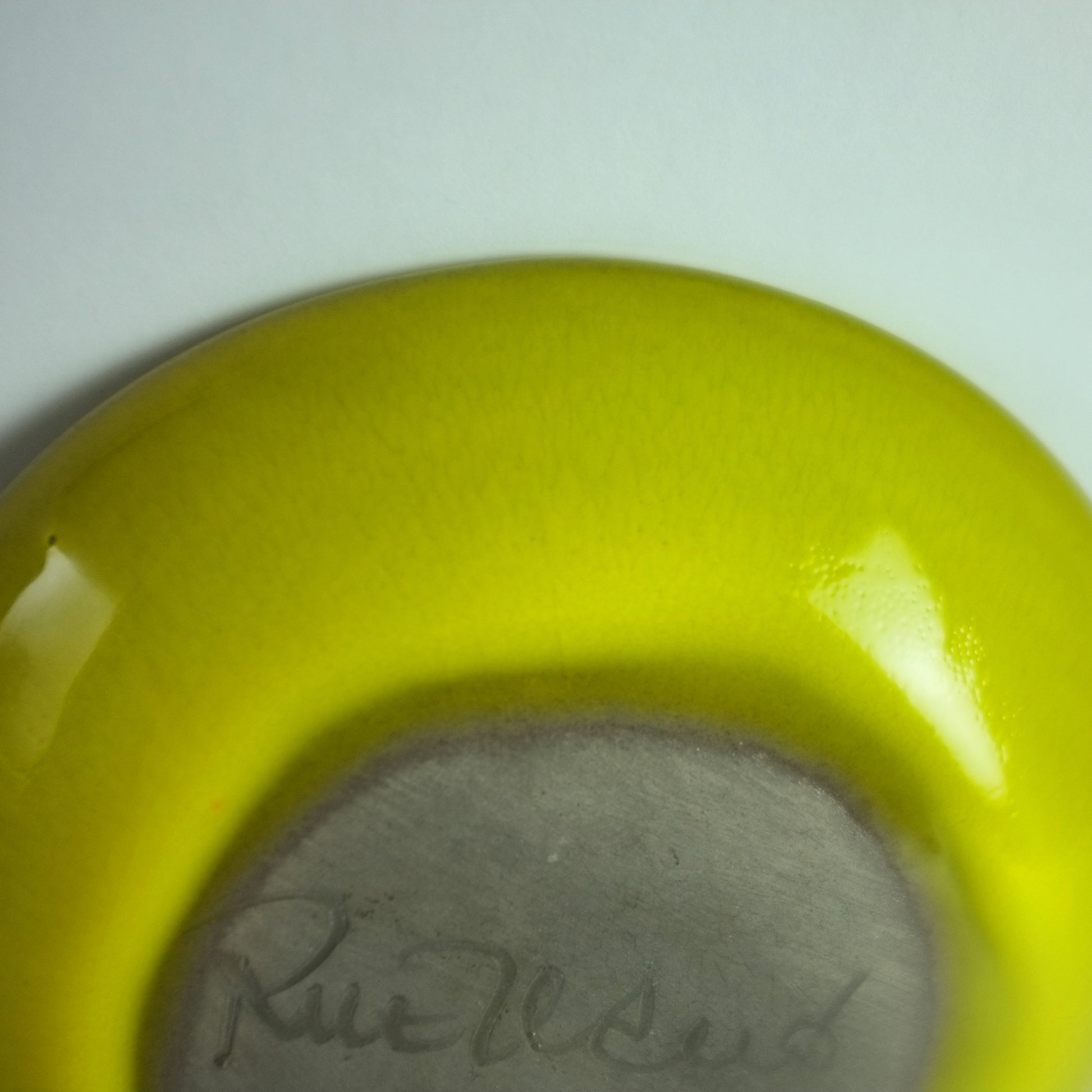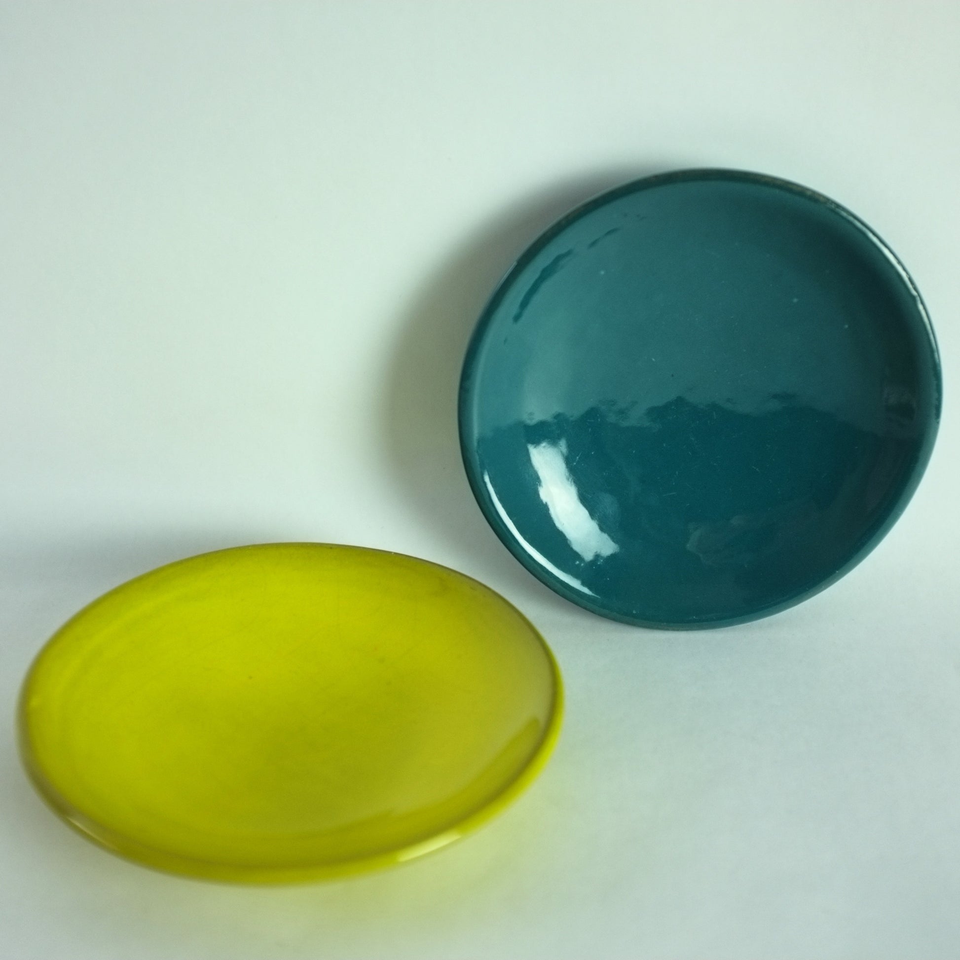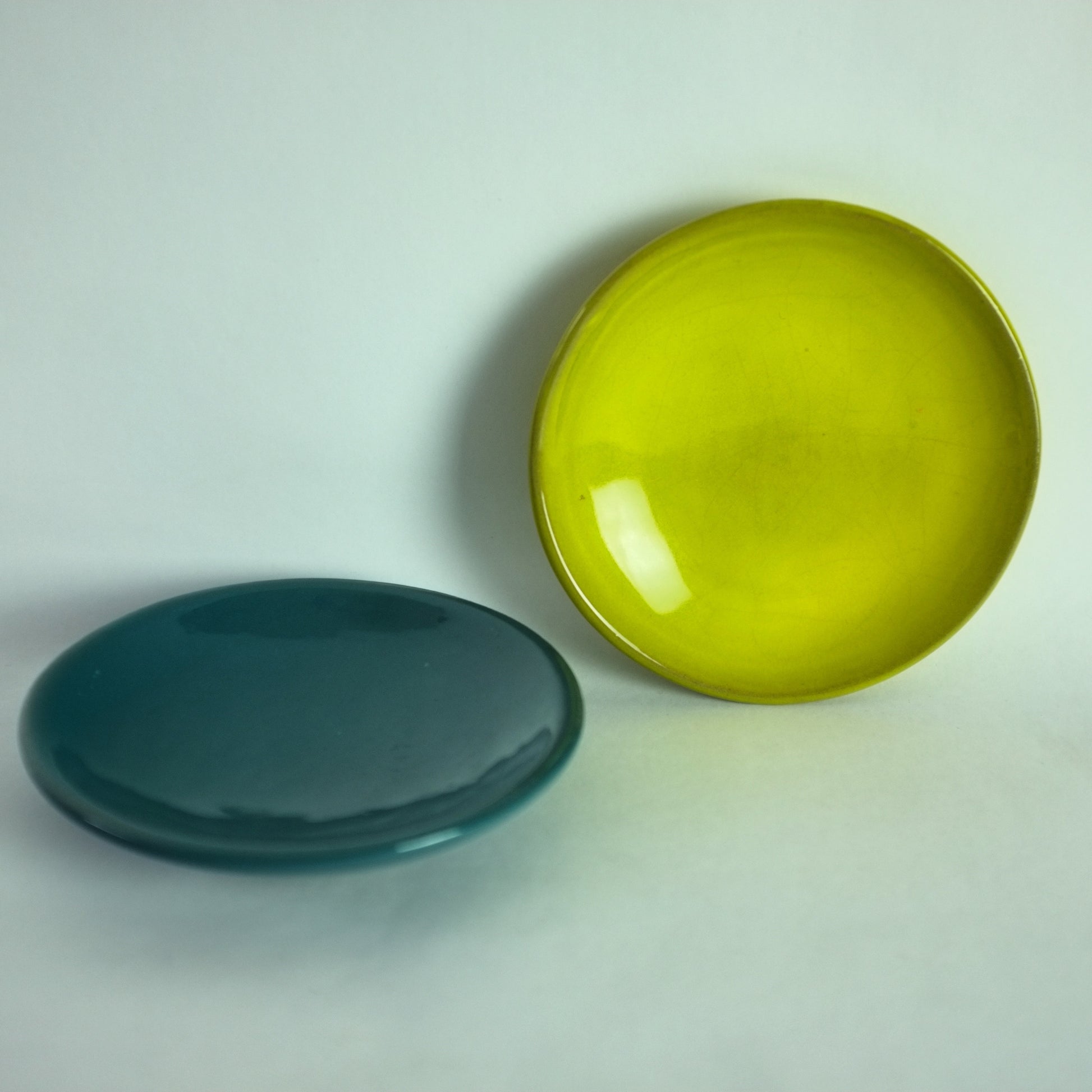 Due piccoli piatti bassi di un verde intenso e l'altro di un giallo acceso. Realizzati da Jacques e Dani Ruelland nel loro studio a Les Angles nel sud della Francia negli anni '50 o '60.