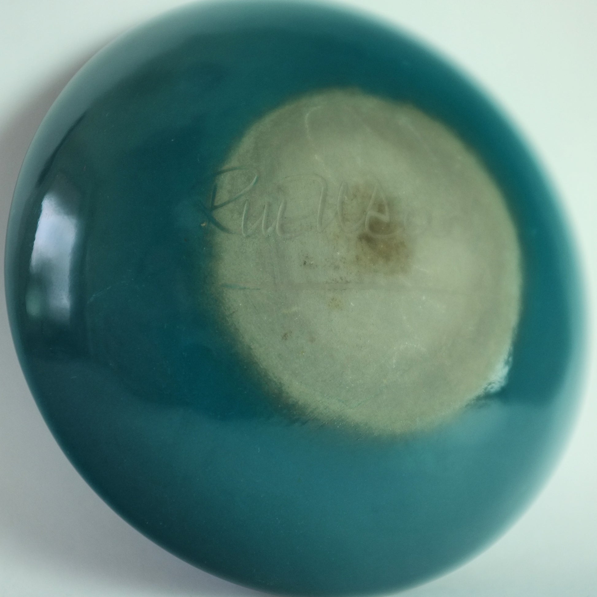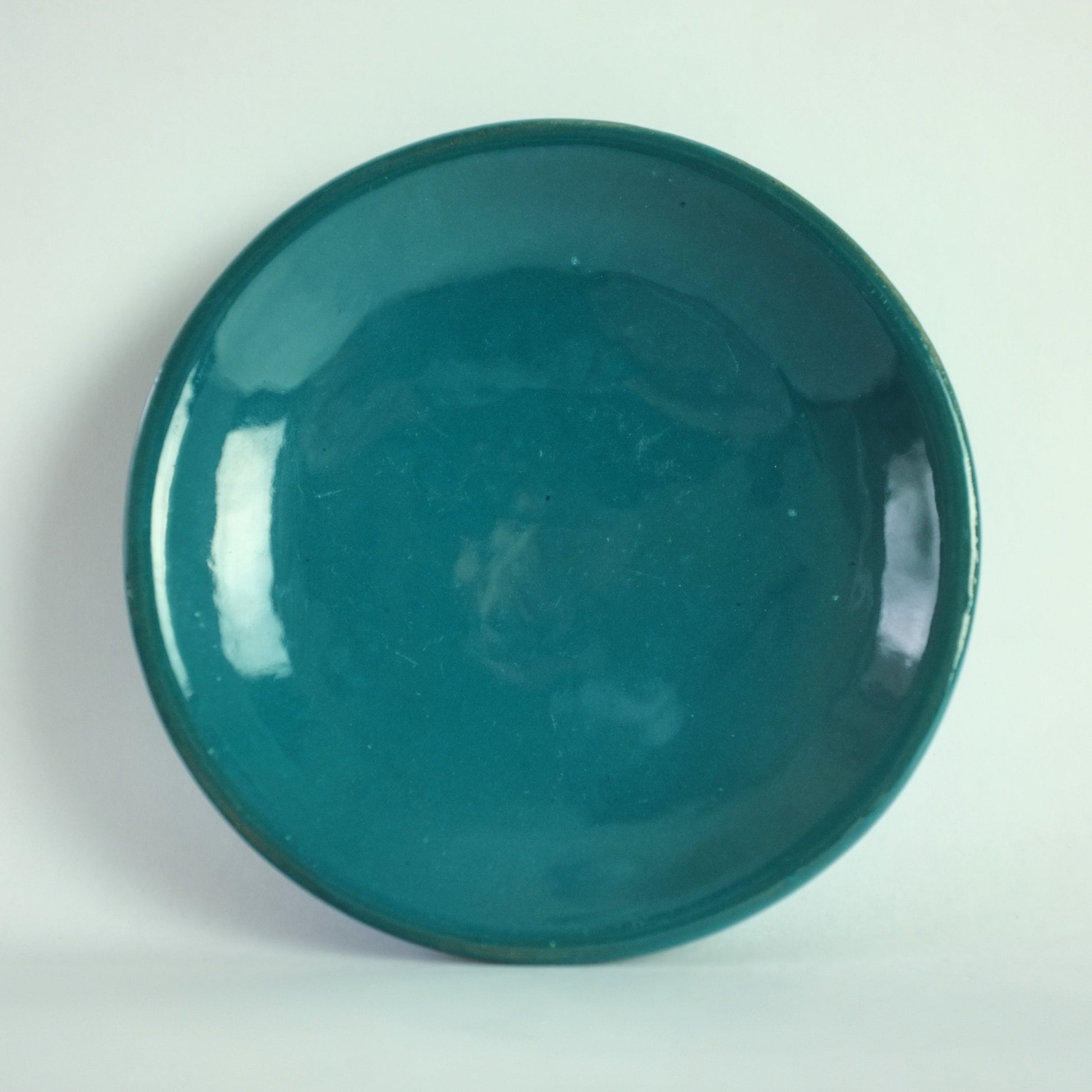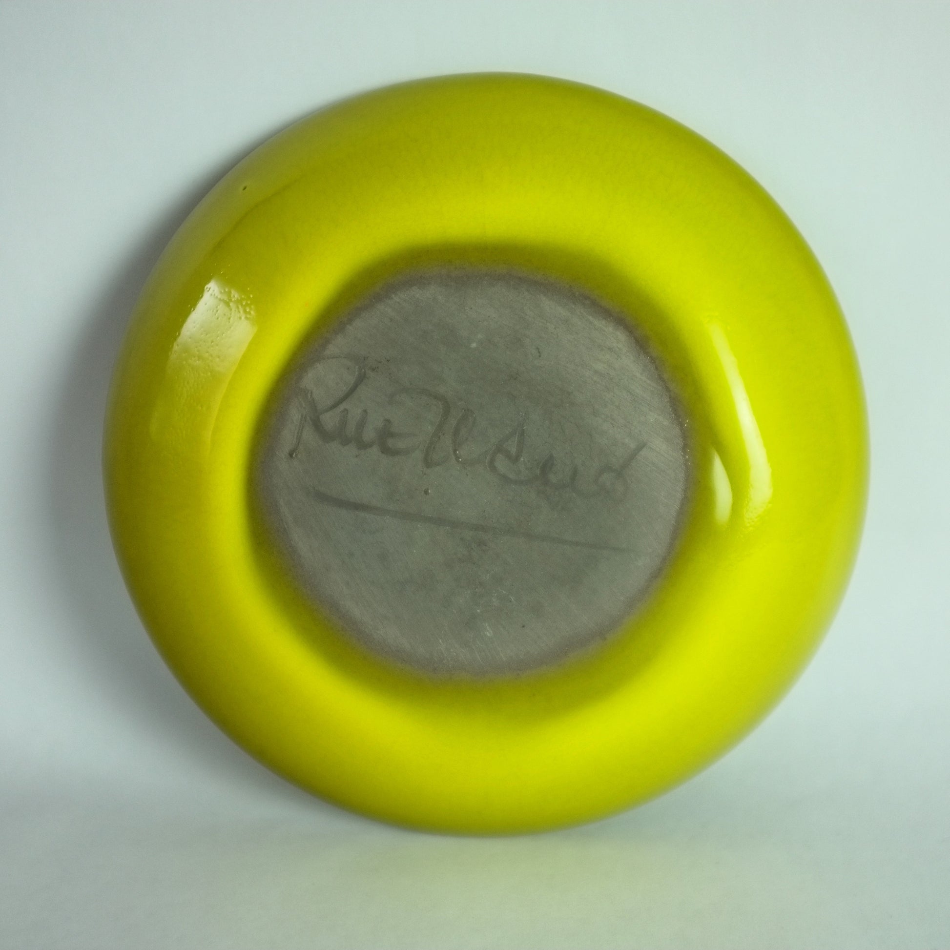 Due piccoli piatti bassi di un verde intenso e l'altro di un giallo acceso. Realizzati da Jacques e Dani Ruelland nel loro studio a Les Angles nel sud della Francia negli anni '50 o '60.